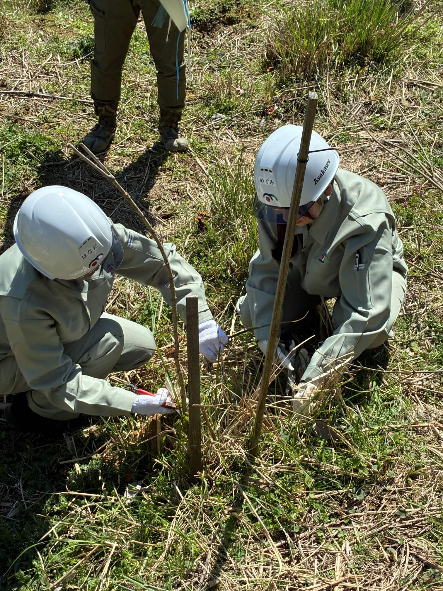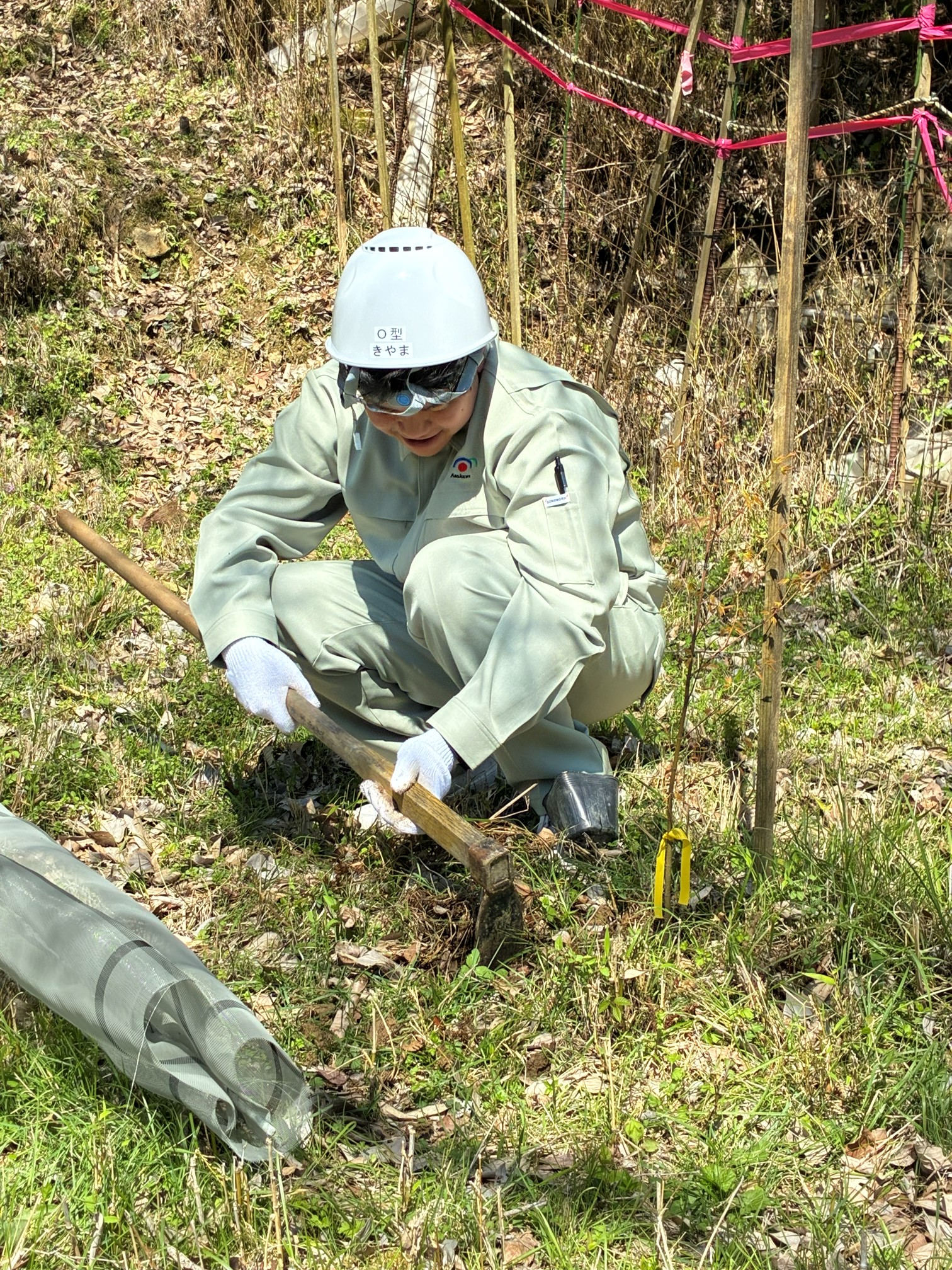 「企業の森」事業に参画している「あさかわの森」にて4月8日に植樹を実施しました。 今回は新入社員と共にサクラ、モミジの苗木を植林し、 動物の食害から守る防護ネットを取り付ける作業を行いました。